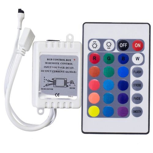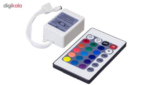 دستگاه کنترل کننده مادون قرمز ریسه های LED جهت کنترل کامل ریسه های ال ای دی کاربرد دارد. روشن و خاموش و تغییر رنگ ال ای دی و تغییر الگوی چشمک زنی نیز توسط همین کنترلر با 24 دکمه انجام می شود .تغذیه این دستگاه 12 ولت DC می باشد.این دستگاه را می توان برای کنترل ال ای دی ها تا 6 آمپر به کار برد .البته می توان از این دستگاه بعنوان کنترل کننده وضعیت های روشن و خاموش در دستگاههای 12 ولتی با حداکثر جریان 6 آمپر نیز استفاده کرد.
